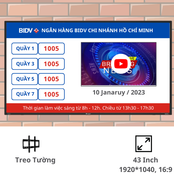 - Tên quầy và số thứ tự đang phục vụ (cho phép hiển thị từ 8 đến 16 quầy).